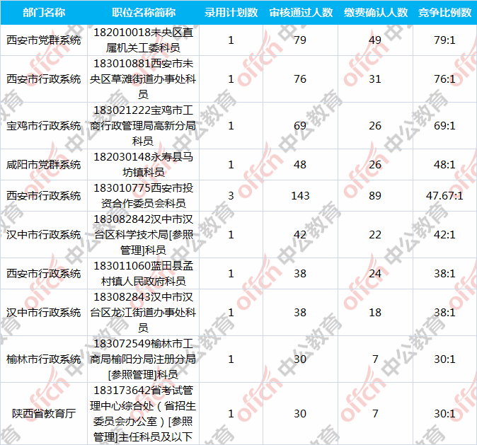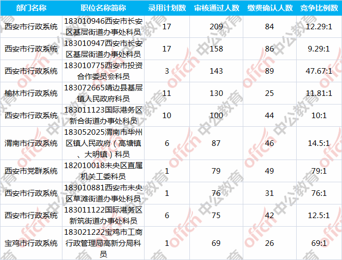 報(bào)名競(jìng)爭(zhēng)最激烈的前十的職位主要集中在西安市黨群系統(tǒng)、西安市行政系統(tǒng)、寶雞市行政系統(tǒng)等部門,具體信息如下: