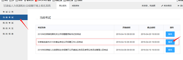 注冊后登錄甘肅省人力資源和社會廳網(wǎng)上報(bào)名系統(tǒng),點(diǎn)擊左上角“當(dāng)前考試”,點(diǎn)擊“武威市2018年事業(yè)單位公開招聘考試”。