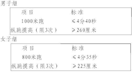 (1)體能測(cè)試。體能測(cè)試不合格者不能進(jìn)入筆試。體能測(cè)試項(xiàng)目和標(biāo)準(zhǔn)如下(測(cè)試時(shí)間地點(diǎn)另行通知):