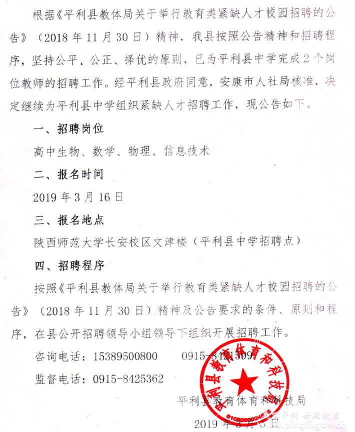 2019陜西平利縣教育體育和科技局教育類緊缺人才校園招聘補(bǔ)充公告