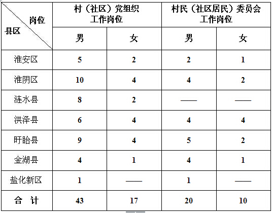 全市選聘到村(社區(qū))任職高校畢業(yè)生90名,其中淮安區(qū)10名、淮陰區(qū)20名、漣水縣10名、洪澤縣18名、盱眙縣20名、金湖縣10名,淮安鹽化新材料產(chǎn)業(yè)園區(qū)2名(以下簡稱鹽化新區(qū)),具體崗位要求如下:
