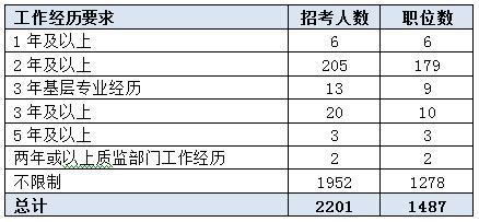 本次考試招錄對(duì)考生的基層工作經(jīng)歷比較細(xì)致,年數(shù)比較具體,且對(duì)工作經(jīng)歷進(jìn)行具體劃定,部分職位要求必須是基層專業(yè)經(jīng)歷,還有2個(gè)職位要求必須是質(zhì)監(jiān)部門的工作經(jīng)歷,由此可看出,專崗招專人是大勢(shì)所趨。