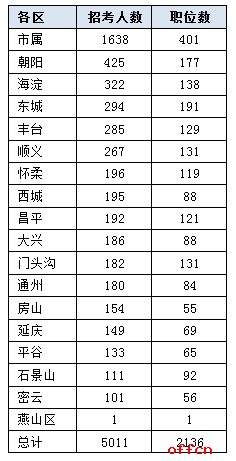 本次京考涵蓋了北京市各區(qū)縣,其中朝陽區(qū)招錄人數(shù)最多,高達425人,海淀區(qū)緊隨其后,招錄322人,招錄人數(shù)最少的是燕山區(qū),僅招錄1人,北京市各區(qū)發(fā)展程度有差距,生活環(huán)境也會有所差異,考生們在報名時要事先有所了解。