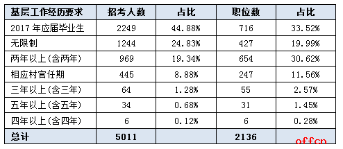 本次招錄中明確要求只有2017年應(yīng)屆畢業(yè)生可以報考的職位有716個,不限制基層工作經(jīng)歷的職位有427個,這些職位應(yīng)屆生均可報考,占總職位數(shù)的53.51%,要求兩年基層工作經(jīng)歷的職位有654個,占總職位數(shù)的30.62%,大學(xué)生村官需計算一下自己的任期是否已滿,某些定向招錄大學(xué)生村官的職位還需具備一定的專業(yè)技能,比如北京市西城區(qū)人民法院綜合行政部門的一個職位除了要求考生是2017年北京地區(qū)服務(wù)期滿的大學(xué)生村官外,還必須取得會計從業(yè)資格證書,因此,選職位時考生一定要仔細。