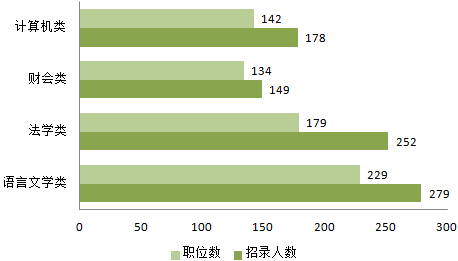 本次考試共有887個職位不限制專業(yè),占到總職位數(shù)的一半左右,說明報考條件正在放寬。語言類、法學類、財會類、計算機類是本次考試招錄的四大熱門專業(yè),其中語言文學類專業(yè)以279人、229個職位領(lǐng)先,成為本次招錄的“人氣”專業(yè)。