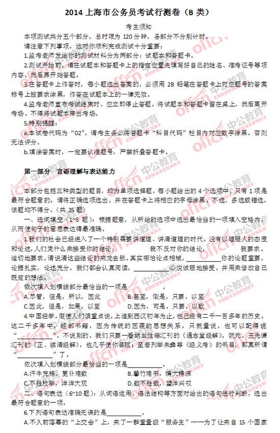 2014上海市公務(wù)員考試行測(B類)