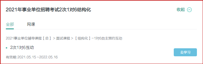 示例:以下以2021事業(yè)單位輔導(dǎo)課程【總】 > 面試課程 > 【結(jié)構(gòu)化】-1對(duì)6自主預(yù)約互動(dòng)互動(dòng)課程為例: