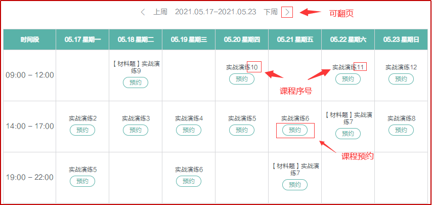 (3)課表時(shí)間段有可翻頁的選項(xiàng),可以進(jìn)行近一周的課程安排。課表是循環(huán)安排,每周五更新下一周課表,課表持續(xù)更新至考前;