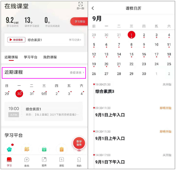操作:課程模塊,點擊“查看課表”可查看近期課程安排,點擊課程可快捷進入直播或觀看直播回放內(nèi)容。