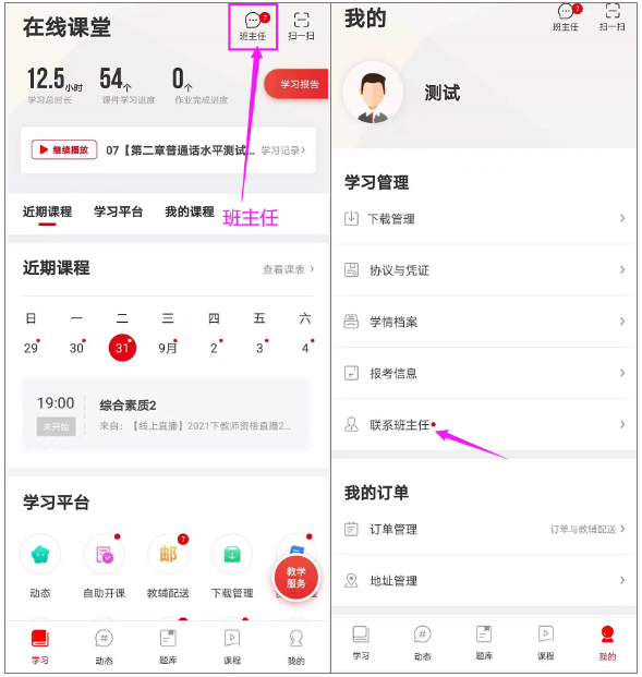 學員可以通過APP【課程】右上角“班主任”,聯(lián)系配套課程的班主任溝通直播課等相關問題。