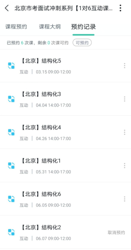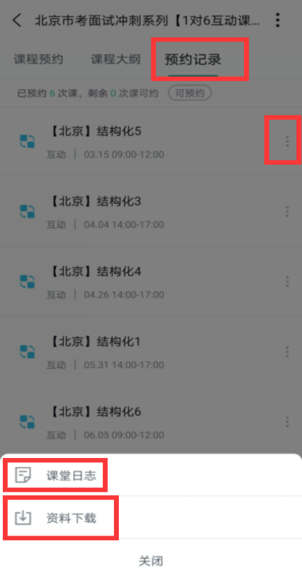 操作方法:登錄進(jìn)入"互動(dòng)課程首頁",從"預(yù)約記錄"中可以查看已經(jīng)上課的課程記錄,每次課程記錄中可以顯示參加的練習(xí)日志和下載本次課程的場外題目。