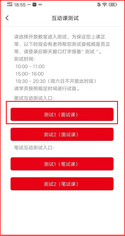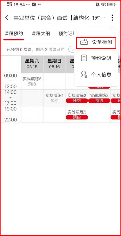 1.請(qǐng)點(diǎn)擊 "1對(duì)6互動(dòng)入口---右上角三個(gè)小點(diǎn)",選擇“設(shè)備檢測”進(jìn)入,然后點(diǎn)擊測試1(面試課)進(jìn)入后頁面顯示如下: