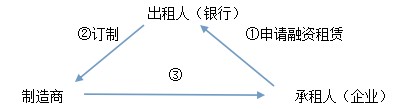 例如作為一個小微企業(yè),現(xiàn)在需要進行生產(chǎn)線的升級,購進一臺價值100萬元的專用設(shè)備,但是沒有足夠的資金,那么只能去找實力雄厚的金融機構(gòu)-銀行幫其購買,作為銀行,只是有錢不能生產(chǎn)設(shè)備,于是銀行就找到了能夠生產(chǎn)設(shè)備的制造商進行訂制,生產(chǎn)完成后交給企業(yè),企業(yè)就可與銀行簽訂融資融資合同,建立了租賃關(guān)系。如圖: