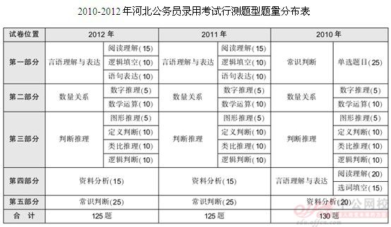 中公教育專家在深入研究河北 的基礎(chǔ)上,總結(jié)了河北行測(cè)考試各個(gè)部分的命題特點(diǎn),并結(jié)合公務(wù)員考試的整體發(fā)展變化情況,分析未來河北省行測(cè)考試的命題確實(shí),幫助大家從整體上認(rèn)識(shí)河北公考,把握備考方向,學(xué)習(xí)效率。下表是2010、2011、2012年河北公務(wù)員考試行測(cè)部分的基本情況: