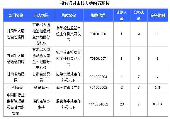 報(bào)名通過審核人數(shù)前五的職位主要集中在甘肅省出入境檢驗(yàn)檢疫局、甘肅省地震局、蘭州海關(guān)等部門,具體信息如下: