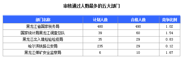 截止15日17時,通過審核人數(shù)前三位的部門依次是:黑龍江省國家稅務局、國家統(tǒng)計局黑龍江調(diào)查總隊、黑龍江出入境檢驗檢疫局,三部門通過審核總?cè)藬?shù)達579人,占通過審核總?cè)藬?shù)的91.9%。