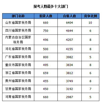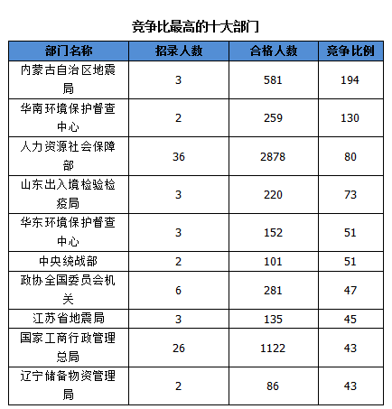 與上午九時(shí)數(shù)據(jù)相比,報(bào)名人數(shù)最多十大部門(mén)清一色為國(guó)稅部門(mén),報(bào)名人數(shù)最多的山東國(guó)稅,招660人,共6404人報(bào)名,報(bào)名人數(shù)翻倍增長(zhǎng),目前競(jìng)爭(zhēng)最激烈的部門(mén)是內(nèi)蒙古地震局,招錄3人,已經(jīng)有581人報(bào)名,成為截止目前最“擁堵”的部門(mén)。