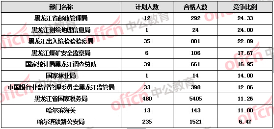 為幫助廣大考生更清晰的了解今日?qǐng)?bào)名情況,黑龍江中公教育整理了審核通過(guò)人數(shù)前十位的部門以及競(jìng)爭(zhēng)比例最激烈的部門,供廣大考生參考: