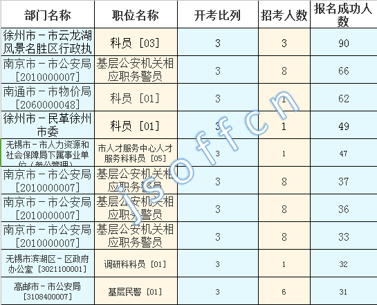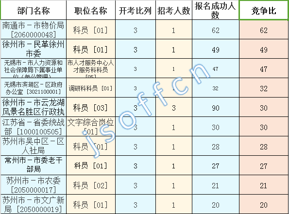 截至12日16時,江蘇省報名人數(shù)最多的職位為:徐州市-市云龍湖風(fēng)景名勝區(qū)行政執(zhí)法大隊(參公管理) [2030000101]、科員 [03],一共有90人報名,競爭最激烈的職位為南通市-市物價局 [2060000048] 、科員 [01],招錄62人,報名人數(shù)為62人,報名通過審核人數(shù)前十的職位主要集中在南京市公安局、南通市物價局、徐州市云龍湖風(fēng)景名勝區(qū)行政執(zhí)法大隊等部門,具體信息如下: