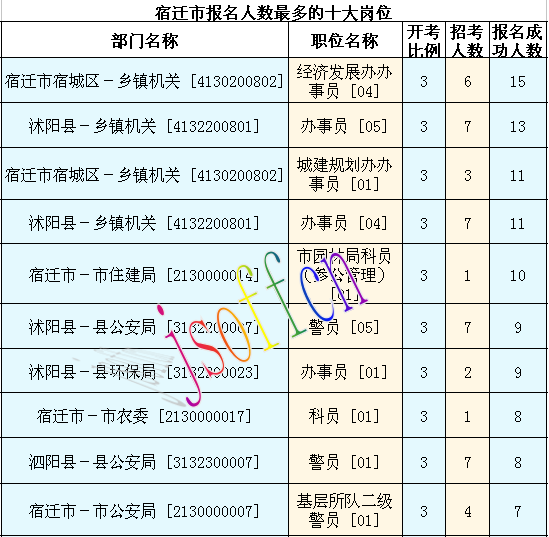 截至12日15時(shí)53分,宿遷市報(bào)名人數(shù)最多的職位為:宿遷市宿城區(qū)-鄉(xiāng)鎮(zhèn)機(jī)關(guān) [4130200802],一共有15人報(bào)名,競(jìng)爭(zhēng)最激烈的職位為市園林局科員(參公管理) [01],招錄1人,報(bào)名人數(shù)為10人,報(bào)名通過審核人數(shù)前十的職位主要集中在宿遷市宿城區(qū)-鄉(xiāng)鎮(zhèn)機(jī)關(guān) [4130200802]、沭陽縣-鄉(xiāng)鎮(zhèn)機(jī)關(guān) [4132200801],具體信息如下: