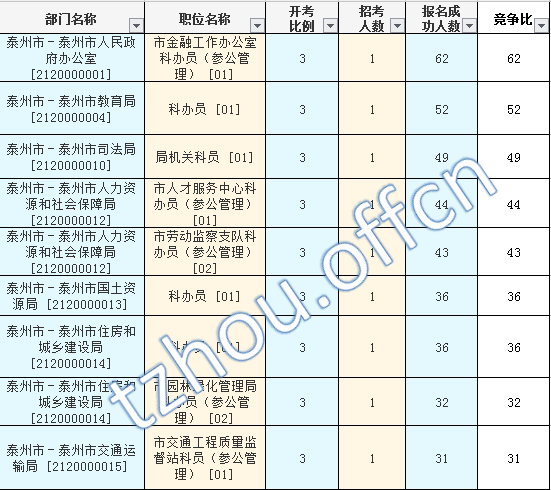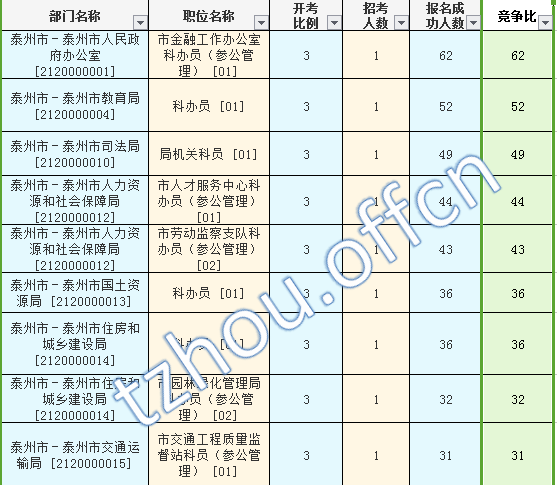 截至14日16時,泰州城市報名人數(shù)最多的職位為:市金融工作辦公室科辦員(參公管理) [01],一共有62人報名,競爭最激烈的職位為泰州市-泰州市人民政府辦公室 [2120000001]市金融工作辦公室科辦員(參公管理) [01],招錄1人,報名人數(shù)為62人,報名通過審核人數(shù)前十的職位主要集中在泰州市-泰州市人民政府辦公室 [2120000001]、泰州市-泰州市教育局 [2120000004]]、泰州市-泰州市司法局 [2120000010],具體信息如下: