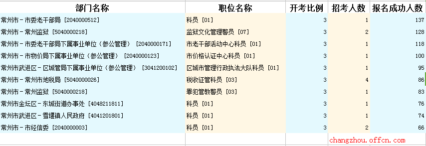 截至16日16時,常州市報名人數(shù)最多的職位為:常州市-市委老干部局 [2040000512],一共有137人報名,競爭最激烈的職位也是常州市-市委老干部局 [2040000512],招錄1人,目前報名人數(shù)為137人,具體信息如下: