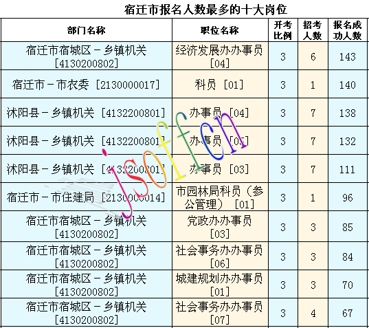 截至16日16時,宿遷市報名人數(shù)最多的職位為:宿遷市宿城區(qū)-鄉(xiāng)鎮(zhèn)機關(guān) [4130200802],一共有143人報名,競爭最激烈的職位為宿遷市-市農(nóng)委 [2130000017],招錄1人,報名人數(shù)為140人,報名通過審核人數(shù)前十的職位主要集中在宿遷市宿城區(qū)-鄉(xiāng)鎮(zhèn)機關(guān) [4130200802]、宿遷市-市農(nóng)委 [2130000017],具體信息如下: