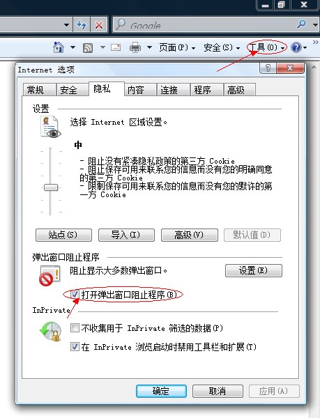 為了報(bào)名操作能夠順利進(jìn)行,請(qǐng)使用IE瀏覽器(Internet Explorer)。調(diào)整瀏覽器屬性,關(guān)閉彈出窗口阻止程序:打開(kāi)瀏覽器,在“工具”菜單的“Internet選項(xiàng)”中選擇“隱私”選項(xiàng)卡,將“打開(kāi)彈出窗口阻止程序”前面的勾取消,然后點(diǎn)【應(yīng)用】。