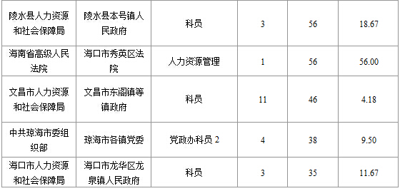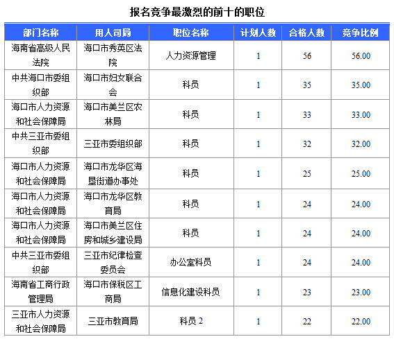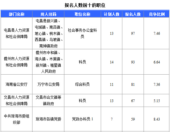 報名通過審核人數(shù)前十的職位主要集中在海南省高級人民法院、??谑腥肆Y源和社會局、海南省林業(yè)廳,具體信息如下: