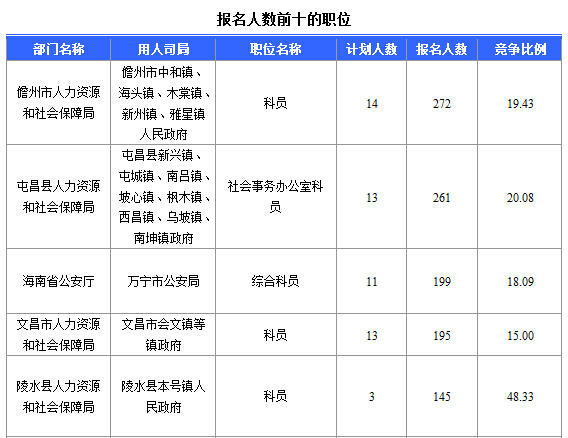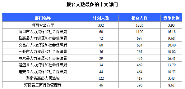 截至16日9時(shí),報(bào)名人數(shù)前三位的部門(mén)依次是:海南省公安廳、海口市人力資源和社會(huì)局、臨高縣人力資源和社會(huì)局,三部門(mén)報(bào)名總?cè)藬?shù)達(dá)3102人,占報(bào)名總?cè)藬?shù)的24.4%。