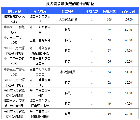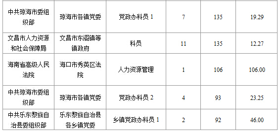 截止16日9時(shí),招錄比例的職位為海南省高級(jí)人民法院??谑行阌^(qū)法院人力資源管理一職,招錄1人,截止16日9時(shí)通過(guò)人數(shù)為106人。