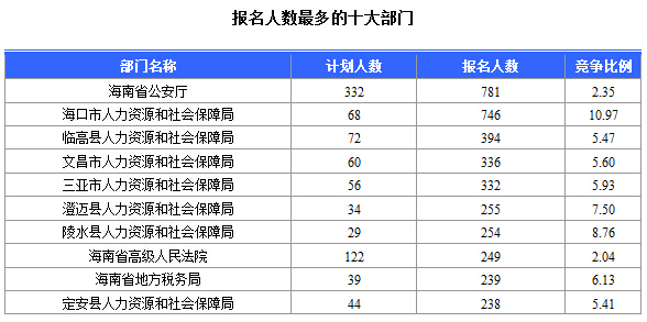 為幫助廣大考生更清晰的了解今日?qǐng)?bào)名情況,中公網(wǎng)校整理了報(bào)名人數(shù)前十位的部門(mén)以及競(jìng)爭(zhēng)比例最激烈的十大部門(mén),供廣大考生參考: