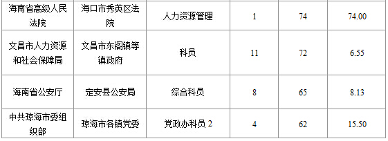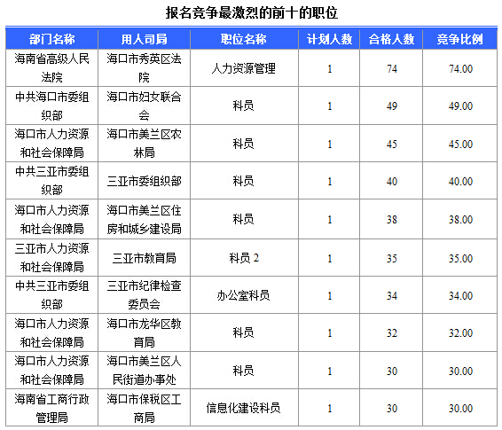 截止15日16時(shí),招錄比例的職位為海南省高級(jí)人民法院??谑行阌^(qū)法院人力資源管理一職,招錄1人,截止15日16時(shí)通過(guò)人數(shù)為74人。