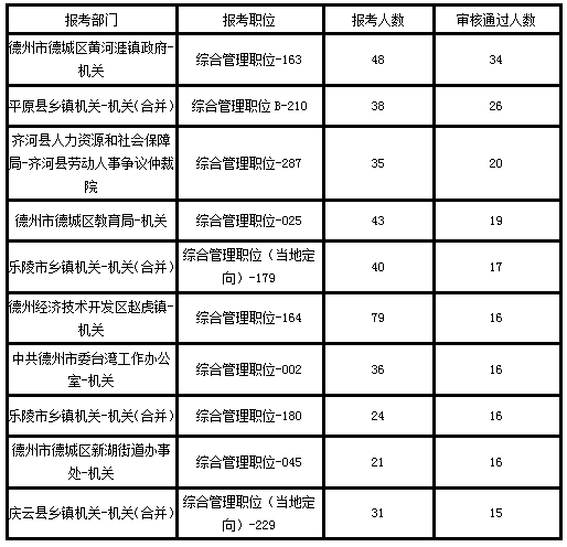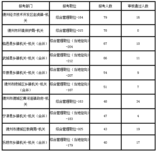 截止3月24日17:00,德州公務(wù)員考試報(bào)考部門人數(shù)最多的崗位依次為:德州經(jīng)濟(jì)技術(shù)開發(fā)區(qū)趙虎鎮(zhèn)、德州市環(huán)境保護(hù)局、臨邑縣鄉(xiāng)鎮(zhèn)機(jī)關(guān)、武城縣鄉(xiāng)鎮(zhèn)機(jī)關(guān)、平原縣鄉(xiāng)鎮(zhèn)機(jī)關(guān)、德州市陵城區(qū)鄉(xiāng)鎮(zhèn)機(jī)關(guān)、德州市德城區(qū)黃河涯鎮(zhèn)政府、寧津縣鄉(xiāng)鎮(zhèn)機(jī)關(guān)-機(jī)關(guān)、德州市德城區(qū)教育局-、樂陵市鄉(xiāng)鎮(zhèn)機(jī)關(guān)。