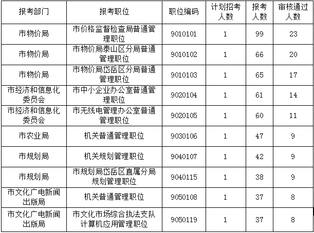 由以上分析可以看出,報名最熱的前三個職位全部為物價局普通管理職位,中公教育數(shù)據(jù)研究專家提醒各位考生,一定要在清晰了解各職位報名情況后理性選擇職位 進行報考,為幫助考生避開過熱崗位,考試幾率,現(xiàn)將審核通過人數(shù)排名前十位的職位、報考人數(shù)前十位的職位以及報考人數(shù)為零的職位總結(jié)如下:
