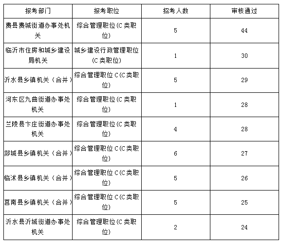 在臨沂的崗位中報(bào)名人數(shù)前三位的分別是費(fèi)縣費(fèi)城街道辦事處機(jī)關(guān)、臨沂市住房和城鄉(xiāng)建設(shè)局機(jī)關(guān)、沂水縣鄉(xiāng)鎮(zhèn)機(jī)關(guān)(合并),報(bào)名人數(shù)分別為44人、30人、29人,其中報(bào)名人數(shù)最多的費(fèi)縣費(fèi)城街道辦事處因招考條件寬泛,只要求大專以上學(xué)歷,其他條件均不限,報(bào)名人數(shù)目前居于榜首,后期會不會成為臨沂之最,我們可以一起關(guān)注。