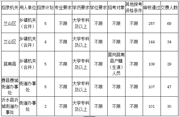 | 蘭山區(qū) | 鄉(xiāng)鎮(zhèn)機(jī)關(guān)(合并) | 臨沂各級機(jī)關(guān) | 5 | 大學(xué)專科及以上 | 不限 | 不限 | 不限 | 5 | 257 | 51.4 |