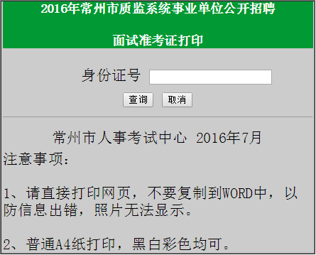 2016江蘇常州市質監(jiān)系統(tǒng)事業(yè)單位招聘面試準考證打印入口