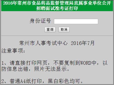 2016江蘇常州市食品藥品監(jiān)督管理局直屬事業(yè)單位招聘面試準考證打印入口