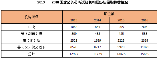 經中公網校專家對中央、省(副省)級、市(地)級和縣(區(qū))級及以下這四個機構層級歷年來的招錄情況分析,中央和省(副省)級招錄職位數總體呈下滑趨勢,2016年和2013年比較總共減招410個職位;市(地)級2014年招錄職位數較2013年略有下滑,2015年、2016年雖連續(xù)增長,2016年招錄的職位數較2013年仍減少了159個;與中央、省(副省)級、市(地)級招錄情況不同的是,縣(區(qū))級及以下的基層招錄的職位數穩(wěn)定增加,2014年招錄的職位數較2013年增加189個,2015年較2014年增長1203個,2016年較2015年更是激增1909個。比起其他幾個機構層級,縣(區(qū))級及以下擴招的職位數是最多的。