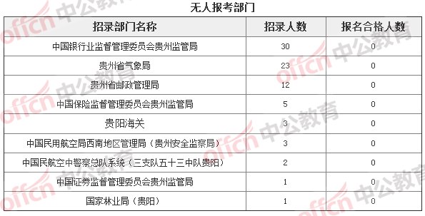 截至15日16時,貴州招錄部門中仍有六大部門的職位無人報考,具體如下: