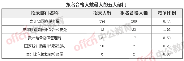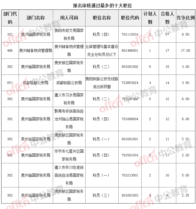 報名通過審核人數(shù)較多的職位主要集中在貴州省國家稅務局、成都鐵路局貴陽鐵路公安處、貴州儲備物資管理局等部門,具體信息如下: