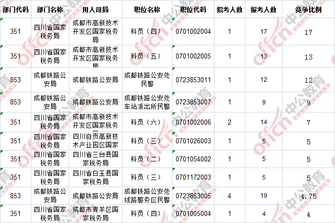 截止到15日16時(shí),競(jìng)爭(zhēng)比例的職位為‘四川省國(guó)家稅務(wù)局成都市高新技術(shù)開發(fā)區(qū)國(guó)家稅務(wù)局’一職,招錄1人,截止到15日16時(shí)通過人數(shù)為17人。