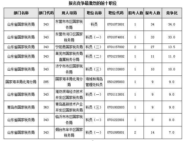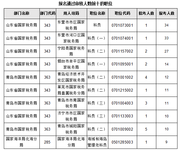 報(bào)名通過審核人數(shù)前十的職位由山東省國家稅務(wù)局包攬了9成,從首日?qǐng)?bào)名情況來看,國稅依然為最搶手的部門。
