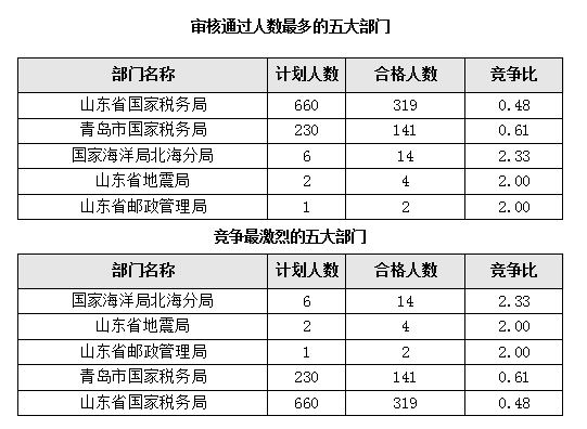 截止到15日16時(shí),通過審核人數(shù)前三位的部門依次是:山東省國家稅務(wù)局、青島市國家稅務(wù)局、國家海洋局北海分局,過審人數(shù)分別為319人、141人、14人。三部門過審人數(shù)共474人,占總過審人數(shù)的99%。
