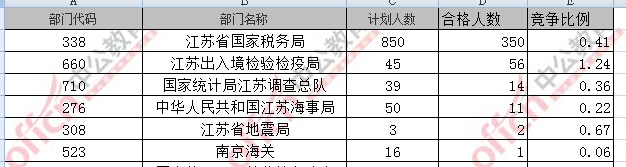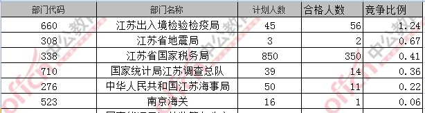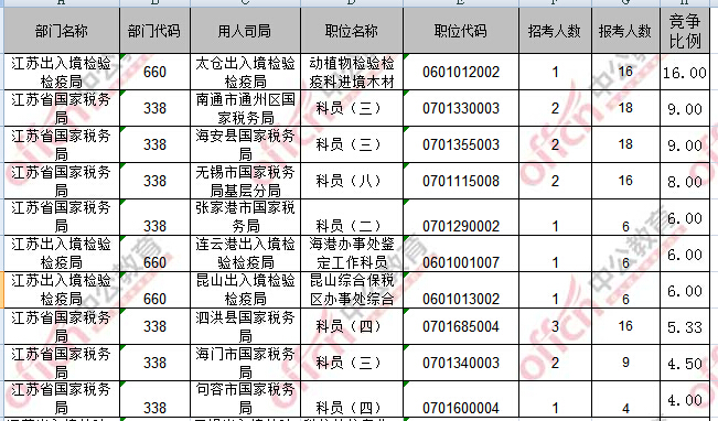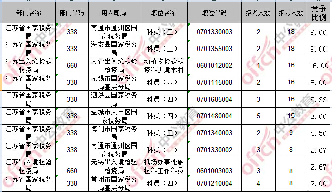 報名通過審核人數(shù)前十的職位主要集中在江蘇省國家稅務局、江蘇出入境檢驗檢疫局部門,具體信息如下: