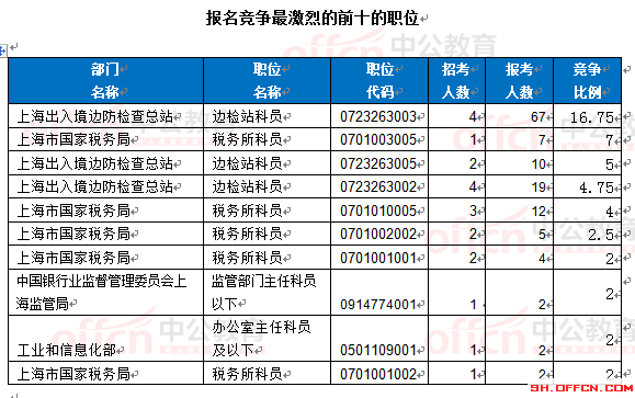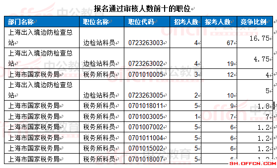 報(bào)名通過審核人數(shù)前十的職位主要集中在上海出入境邊防檢查總站、上海市國(guó)家稅務(wù)局,具體信息如下: