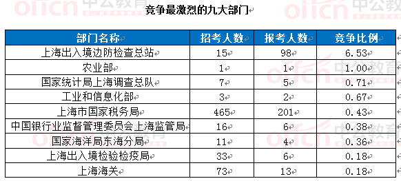 為幫助廣大考生更清晰的了解今日?qǐng)?bào)名情況,上海中公網(wǎng)校整理了審核通過人數(shù)前十位的部門以及競(jìng)爭(zhēng)比例最激烈的十大部門,供廣大考生參考: