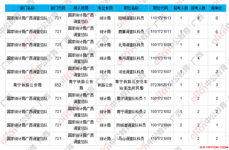 通過審核人數(shù)前十的職位主要集中在國家統(tǒng)計局廣西調(diào)查總隊和部門和南寧鐵路公安局,具體信息如下: