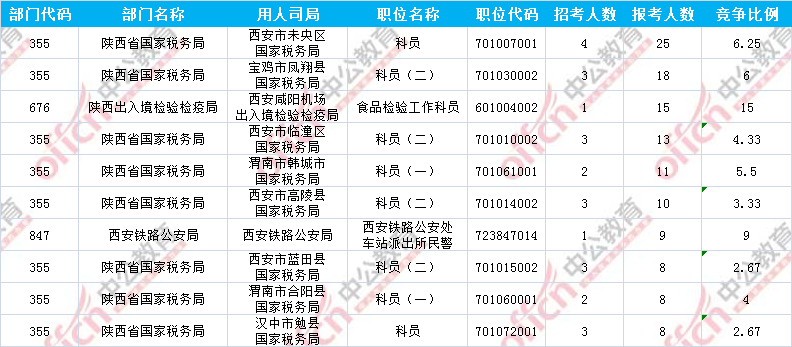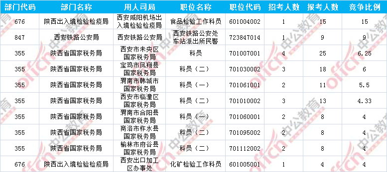 報(bào)名通過審核人數(shù)前十的職位主要集中在陜西省國(guó)家稅務(wù)局、陜西出入境檢驗(yàn)檢疫局、西安鐵路公安局等部門,具體信息如下: